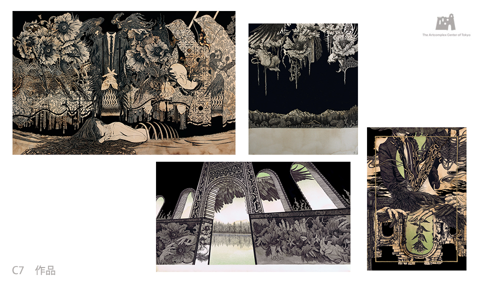 インク・コーヒー・アクリル絵の具・アルミ箔等を使用したミクストメディアでその夢の不条理を表現する。