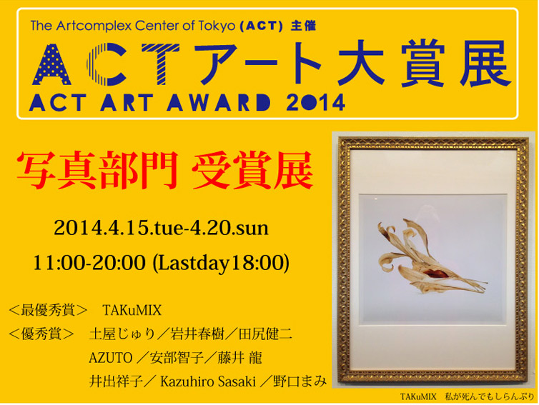 ACTアート大賞展は、The Artcomplex Center of Tokyo(ACT)が2011年より主催しているアートアワードです。2014年より開設された写真部門でも絵画部門と同様に展示審査を行い、最優秀賞受賞者には、賞金として10万円とアートコンプレックスセンターでの企画個展を贈呈いたします。