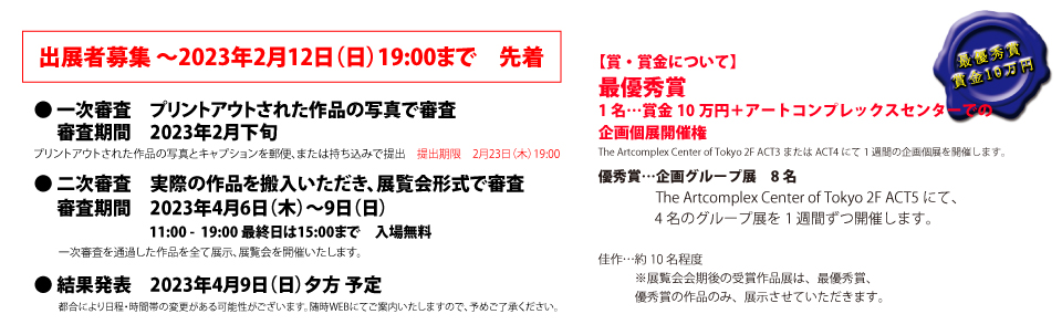 最優秀賞 1名…賞金10万円+アートコンプレックスセンターでの企画個展開催権