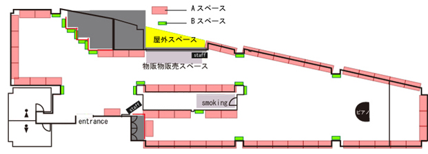 会場内の窓周辺は、物販販売スペースとなり机が並びます。以上をご了承の上、お申込みをお願いいたします。
