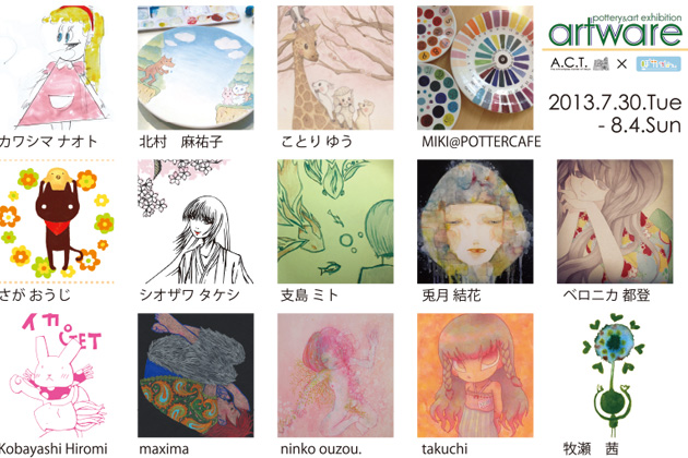 グループ展artwareは、ぽたかふぇ。で陶器に絵付けを行っていただき、焼きあがった後に出来上がったポタリー作品と、作家様自身の作品(絵画や立体)を一緒に展示する展覧会です。