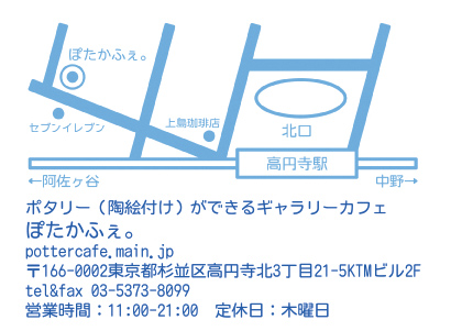 ポタリー作品は、東京・高円寺にある「ぽたかふぇ。」にて絵付けを行っていただきます。