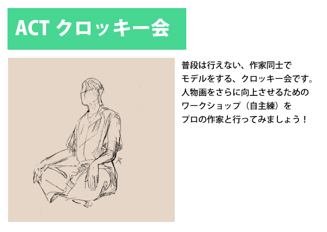 ![]() ACTクロッキー会 ACTが場所を提供するクロッキー会です。 講師はいません。モデルは時間制をもって参加者が交代で行っていただきます。 ただ、ひたすらに描く!ACTクロッキー会にご参加ください! 日程:6/12(水)、6/25(火) 各回12:00〜/2時間程度を予定 定員:各回5名 参加費:500円(税込) 持ち物:クロッキーに必要なもの(会場にはテーブルと椅子のご用意があります) ![]() |