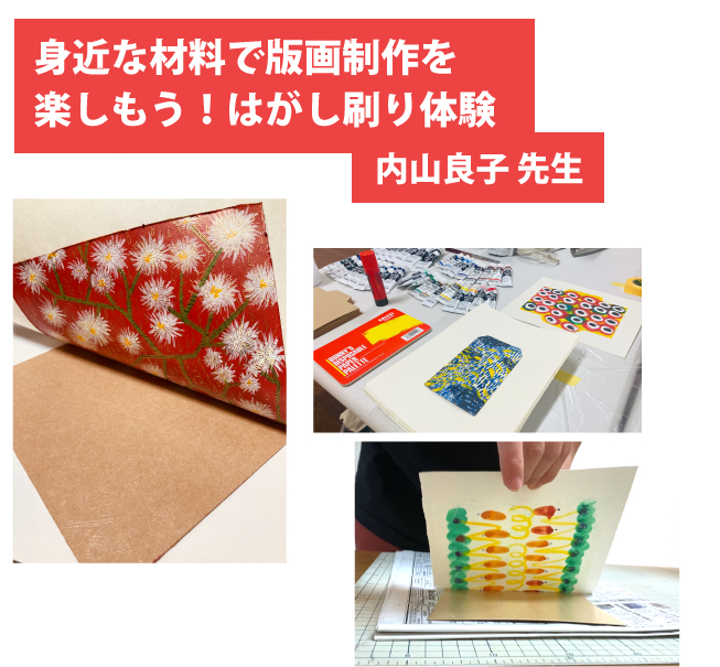 ![]() 版画ワークショップ 身近な材料で版画制作を楽しもう!はがし刷り体験 版画といえば、彫刻刀、プレス機、腐食液など環境が揃っていないと制作できないイメージがありますが、 今回は普段の生活にあるような材料を用いて版画を刷れる「はがし刷り」技法を体験できるワークショップを開催します。 実際に制作をしてもらいますが、絵が描けなくても大丈夫!模様や色で版画を楽しんでいただけます。 ・初級者向け 絵の具遊びの要領で塗りの描写にて制作します。 対象:3歳以上から参加可能、小学生以下は保護者の同伴をお願いします 開催日:6/23(日)12:00-14:00 作業内容:ミニ封筒制作、所要時間1時間程度 参加費用:2,000円(税込) 持ち物:なし。汚れてもよい服装でお越しください。 ・上級者向け 線描+塗りで制作します。普段絵を描いている方向けです。 対象:高校生以上 開催日:6/23(日)15:00-18:00 作業内容:文庫本カバーなど紙媒体の小品制作、所要時間2時間程度 参加費用:5,000円(税込) 持ち物1:エプロン、A4クリアファイル 持ち物2ご持参できる方のみ:筆(自宅にあれば水彩用)/アクリル絵の具(使いたい色があれば) 講師紹介 内山良子 | Ryoko Uchiyama 淡い濃淡で光と影がおりなす空間を表現しつつ、そこに確かに存在するモノが静かに佇む… 時には樹木のようでもあり、時には人を連想させる形を画面に配置しながら、 存在と存在の関係性が生み出す緊張感や、様々な感情を表現する事をコンセプトにしています。 横浜で生まれ。 幼少期から絵が好きで油画で女子美術大学へ進学するも、版画という技法に興味を持ち版画コースへ。 最初は銅版画を中心に制作する予定が、(心の中の)木版アイドル清宮質文さんの作品と出会い木版一筋へ。 といいつつ最近は剥がし刷りでも制作。 ![]() |