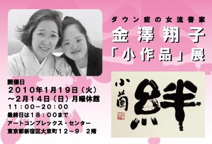 「希望がないから育てられない」と思って、私は二十余年前、絶望の渕に生きていた。しかし、今は、あれはおかしな思い込みだったと思う。将来への希望というものは、誰に対しても幻想であり、未来のことは不明である。 それなのに、知的障害者だからもう希望はない、と思い込んでいた。健常者でも障害者でも平等に一寸先は闇であり、また光明でもあり得るのに・・・・・・。翔子に悪いことをしてしまった。ダウン症であることが悲しく、胸に抱きかかえては、涙を流していた。 (かまくら春秋社刊「天使の正体」より) このような時を経て、今、翔子は幸いに書の道を見つけ、明るく生きて居ります。多くの方に、この元気溌剌の知的障害者・翔子の姿に少しでも夢や希望を見出して頂けたらと思い、活動を続けて居ります。金澤 泰子
