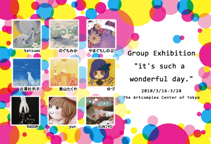 カラフルでハッピーな作品の数々に会いに来て下さい... it's such a wonderful day. 2010/3/16(tue)-3/28(sun) 11:00-20:00(最終日は18:00まで) 月曜休館 The Artcomplex Center of Tokyo ACT5 参加作家: 古澤杜宇子 のぐちみか やまぐちしのぶ yun ゆづ 栗山たくや RAGOM katsuwo GUNJYO |