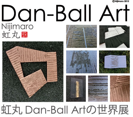 「素材と表現」をコンセプトに制作を続けてきたアーティスト虹丸の新しい表現のテーマは、2011年3月11日の大震災を契機に、全く新しい境地に立ち至った。段ボール素材をレリーフ彫刻する虹丸DAN-BALL ARTの制作に着手した。段ボールの表面をフルート状の性質を利用して、切る・裂く・破る・捻る・千切る・潰す・引っ掻く・穴を開ける・燃やす・擦る・焦がす・ぶつける・蝋燭を垂らす・などなど、人間の生活する動作や行動を、いたって普通の様々な手仕事でのアクションを施して、表面にエネルギーをぶつける、シンプルで豊かな表情を生み出す手法を、開発した。さらに表面に粉体塗装を施することで多様な表情を得る事ができた。更に、アナログ回帰にむけてチープな使用済みの段ボールを、アーティスト虹丸が手を加える事によって、全く新しいバリューとハイクオリティの価値を創り出す。それは虹丸マジックとでも言うべき普通であって普通でない、全く新しい価値意識の転換を具体的に示して、衝撃的な世界観を見る人に与える事になった。デジタル化志向から、本来の人間の持っている五感に訴求する当たり前のアナログの力と言えよう。素材の持つ光、匂い、手触り、陰影、音、質感などデジタルが逆立ちしても、リアルな存在感には無力であろう。無意識の意識について、虹丸は長い間、意識下の意識を哲学的に試行錯誤しながら制作を続けて来た。1970年代のフルクサス運動や、ルネサンスの彫刻家が石から魂を取り出すといった歴史的事実を下敷きに、素材が制作行為を自ずと生み出す、自然な境地を目指してきた。虹丸のDAN-BALL ARTはこういった流れから、自然に誕生した。スティーブ・ジョブス氏は言っていた禅のように「簡素なものは美しい」と・・・。 虹丸