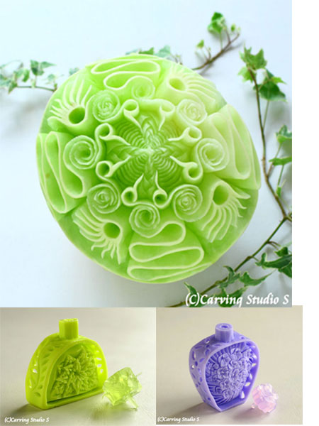 果物・野菜・石けんに草花や動物を彫刻するカービングの教室Carving Studio Sの生徒及び講師の作品展。