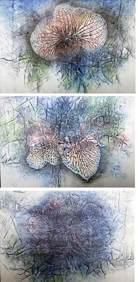 私の作品は従来の木版画技法による作品と、版を拓刷り(フロッタージュ)した雁皮紙をキャンバスや版画用紙の支持体に貼り込んだ作品の二つの傾向で近年は表現を試みています。