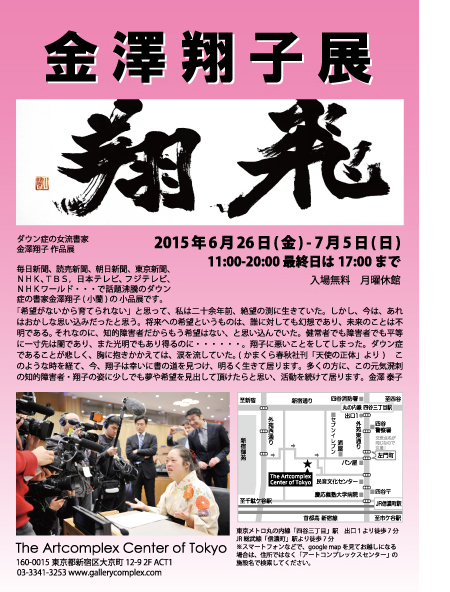毎日新聞、読売新聞、朝日新聞、東京新聞、NHK、TBS,日本テレビ、 フジテレビ、NHKワールド・・・で話題沸騰のダウン症の書家金澤翔子(小蘭)の 小品展です。