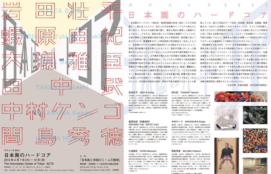明治維新から約150年、アジア・太平洋戦争敗戦から70年が経つ今日、現在の私たちが立つのもその延長線上である。すなわち日本画のハードコアの担い手は、ドメスティックでありながらも自閉的ではなく、伝統主義者というよりはアヴァンギャルドであり、近代に作られた日本画の制度とその歴史的過程でリミックスされ続けている主題と技法に対する批評的まなざしを持つ。美学校主催「ギグメンタ2015」の一環で開催する本展が狙うのは、制作テーマも世代も異なるものの大学で日本画を専攻した6名の作家によって、日本画の超克や現代美術化を狙うのではなく、そして多様性の名の下に日本画の定義不可能性を語るのではなく、これこそが日本画のハードコアだと断言してみせることで、来るべき日本画を確信犯的に誘発することにほかならない。(小金沢智/本展企画者)」