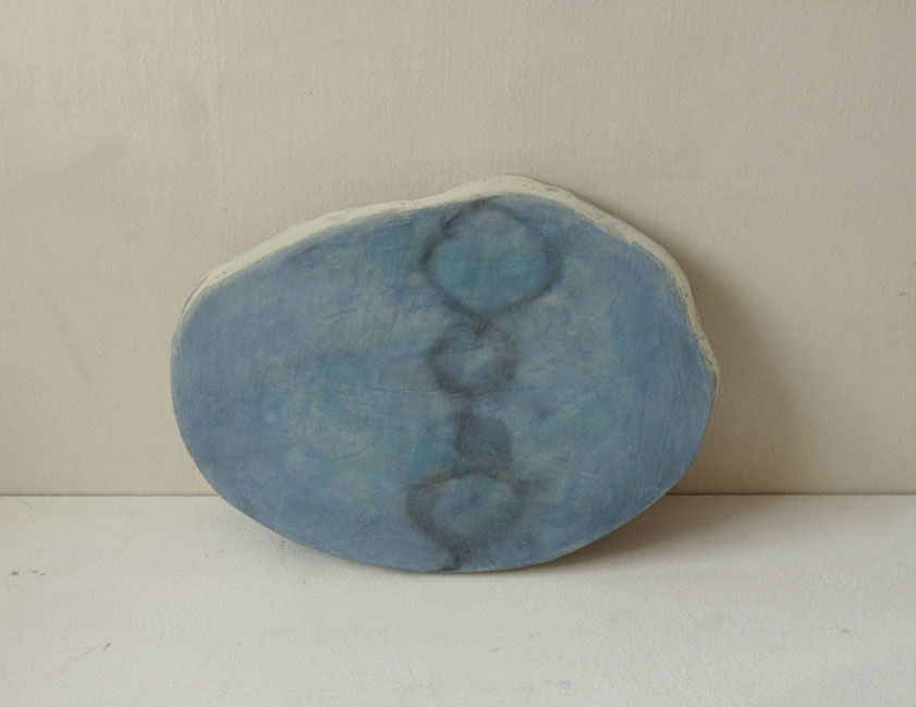 シナの合板を不定形に削り出し、成形した支持体を使った変形作品は、陶片や古代壁画の断片をイメージしています。