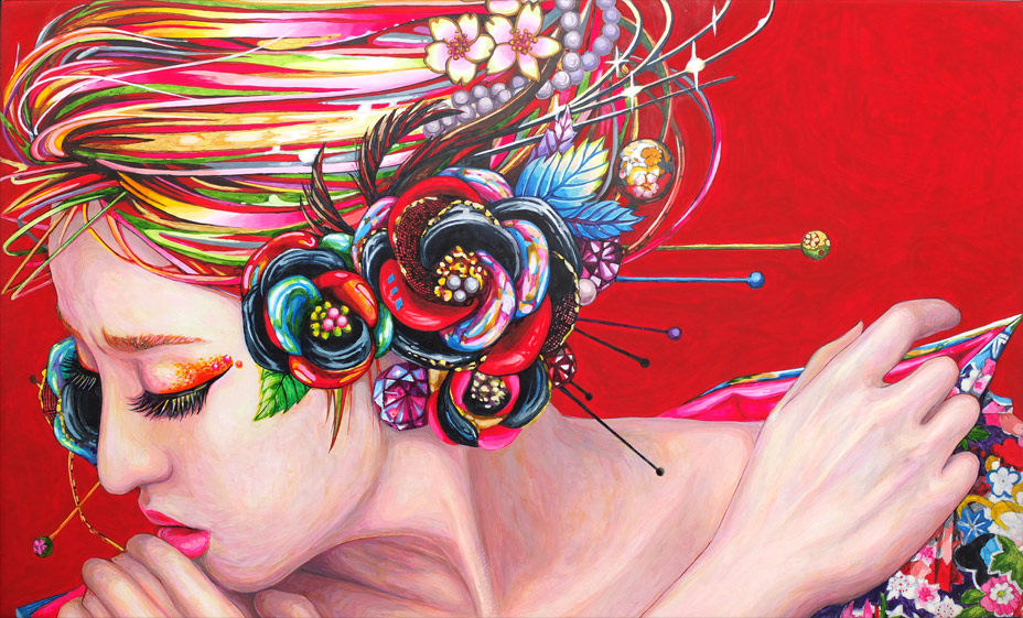 それならば現代美人画はどうあるべきか。美人画のくくりの中で私の感覚にマッチした私自身 の感情を反映させながら描くべきだと思いました。現代社会の中で生きる女性ののぞかせる感情その瞬間を表現したいと思っています。 又、色彩へのこだわりもあります。伝統的な日本色彩と、今ある都会的 サブカルチャー的色彩を取り入れることにより、現代女性の華やかで艶めかしい美を表現したいと考えております。