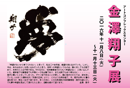 「希望がないから育てられない」と思って、私は二十余年前、絶望の渕に生きていた。しかし、今は、あれはおかしな思い込みだったと思う。将来への希望というものは、誰に対しても幻想であり、未来のことは不明である。 それなのに、知的障害者だからもう希望はない、と思い込んでいた。健常者でも障害者でも平等に一寸先は闇であり、また光明でもあり得るのに・・・・・・。翔子に悪いことをしてしまった。ダウン症であることが悲しく、胸に抱きかかえては、涙を流していた。 (かまくら春秋社刊「天使の正体」より) このような時を経て、今、翔子は幸いに書の道を見つけ、明るく生きて居ります。多くの方に、この元気溌剌の知的障害者・翔子の姿に少しでも夢や希望を見出して頂けたらと思い、活動を続けて居ります。 金澤 泰子