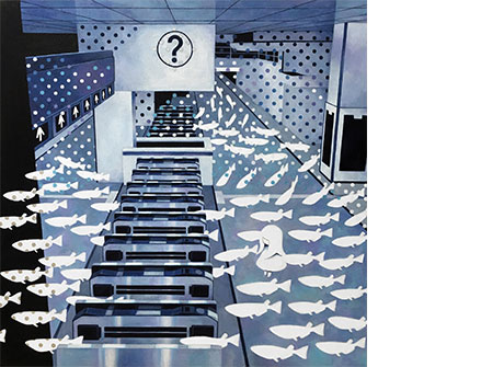 人混みの中で感じる違和感や疎外感、同時に感じる気楽さや開放感など、作家自身の経験を基に様々な印象 を与える色である青を用いて駅や電車を描き、アイデンティティーを問いかける作品を制作。日米で個展、グループ 展を開催。