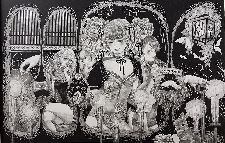 自分という主人公(=牡丹ちゃん)と愛犬レオを題材にした、運命と魂の所在をめぐる物語がテーマの版画です。黒と白をベースにしながら、絵本の挿絵や大判アートポスターのような構成が主体です。60〜70年代の劇画マンガやアングラ演劇が題材としていた精神的な暗がりを、それらが払拭されたかに見える2010年代の光景にも地続きになっているものとして、リトグラフで表現したいです。