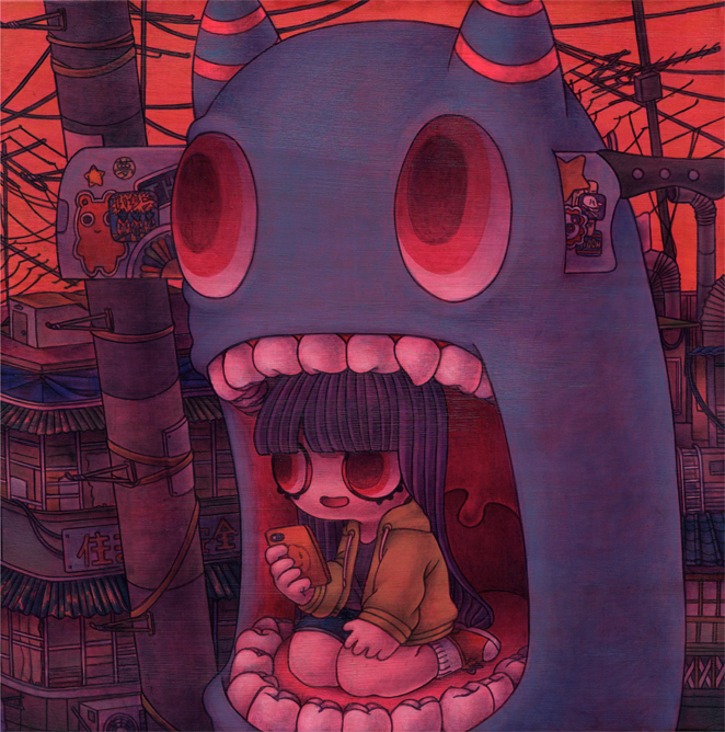 物事の中で対極する2つの要素が混在する世界観を舞台に、その情景やキャラクターそのものを、主にマゼンタの色調で描いている。
