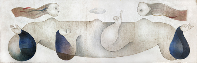 在学中より木版の油性凹版を用い、女性体でもなく、男性体でもない狭間のもの達のかたちを描く。