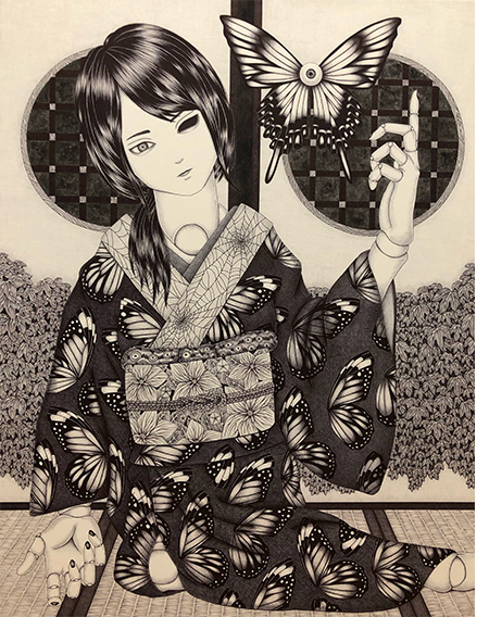 主にボールペンと絵具を使用し、女性をモチーフに思い浮かんできたものを描いています。