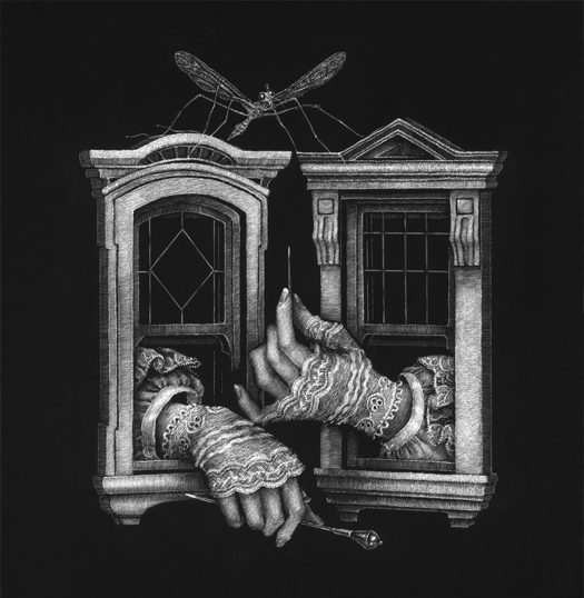 上部の黒い層をニードルやナイフなどの鋭利な道具で削り、下部の白面を浮き出して描く技法。
