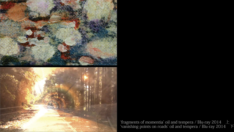 映像メディアを「未知を発見する道具」と考える前田真二郎と、絵画を「みるためのツール」と捉える安喜万佐子による、映像と絵画を軸に、わたしたちが視ているつもりの「風景」を解体していくコラボレーション・プロジェクト。本展では、安喜の「風景」絵画の中に潜む「景」を前田がマクロレンズによって浮かび上げることから展開した -fragments of momentia- と、私たちの「みること」に入り込んで離れない20世紀的遠近法を軽やかに無効にする映像作品 -vanishing points on roads- を展示する。