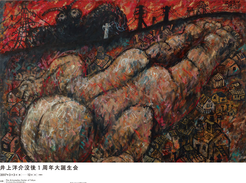市川の井上洋介家には沢山のタブローが残されている。できればその全部をお見せする気持ちで、新宿大京町のアートコンプレックスセンターへ運ぶ、そして延べ百メートルもある地下大ホールの壁に掛ける。井上洋介のタブローを掛ける。パルコギャラリーとの違いは、制作年順に並べてほんの少しでも井上洋介というタブロー画家としての全貌をさぐる、といった嗜好である。