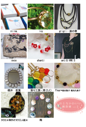 “おとなでも身につけられるかわいい雑貨”がテーマ。 布・紙小物からアクセサリー等を展示販売いたします。 出展作家 梅 ovce antiQ HRK:S 彩り工房・澤(たく) niina fleur * 船田聡子 菊池久美子 ivy 櫻井 若葉 shanti grigri・漆の華 タク三 ☆制作オタク三人組☆ 募集要項