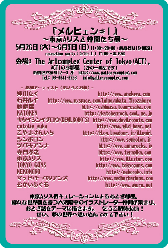 『メルヒェン♯1』-東京Aリスと仲間たち展- 5月26日(火)〜6月7日(日) 11:00〜20:00(月曜休館・最終日は18:00まで) Reception party:30(土)17:00〜 会場:The Artcomplex Center of Tokyo (ACT), ACT1のお部屋(2Fの一番左です) 住所:〒160-0015 東京都新宿区大京町12−9 2F Tel/Fax: 03-3341-3253 http://www.gallerycomplex.com info@gallerycomplex.com 内容:東京Aリス初キュレーションによるおとぎ部屋。 様々な世界観を持つ大活躍中のイラストレーター仲間が集まり、おとぎ話をテーマに描きます。 乞うご期待!ぜひ、夢の世界へ迷い込んでみて下さい! 参加アーティスト(あいうえお順): 姉川たく http://www.anekawa.com 石井ルイ http://www.myspace.com/luinoyakata_7irozakuro 絵獅匡 http://eshimasa.team-esaka.com KATOKEN http://katokenrock.cool.ne.jp キタイシンイチロウ(DEVILROBOTS) http://www.devilrobots.com cotolie yuka http://www.wild-boar.net こやまけんいち http://blog.livedoor.jp/illegirl シンボロン http://www.symbolon.jp ツバキアンナ http://www.annarocks.jp 寺門孝之 http://www.terapika.com 東京Aリス http://www.illustar.com TOKYO GUNS http://www.tokyoguns.com NEKONOKO http://www.nekonoko.info マッドバーバリアンズ http://www.madbarbarians.com むかいあぐる http://www.aguru.net/ images from... シンデレラ、白雪姫、人魚姫、あかずきん、眠り姫、七匹の子やぎ、 三匹のこぶた、ウサギとカメ、チルチルミチル(青い鳥)、ヘンゼルとグレーテル(お菓子の家)、 不思議の国のアリス、長靴をはいた猫、おやゆびひめ、ピーターパン、ジャックと豆の木、雪の女王様、 雪女、みにくいアヒルの子、ブレーメンの音楽隊、鶴の恩返し、かぐや姫、桃太郎、金太郎、浦島太郎、 一寸法師...など。何が出るかはお楽しみ〜♪