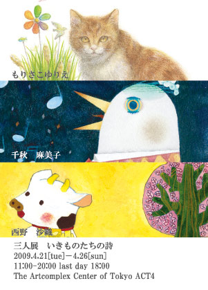 出展作家 千秋麻美子 もりさこゆりえ 西野沙織 絵本出版を目指す三名の作家たち。 いきものをモチーフとした三人展です。 三者三様の個性溢れるいきものたちがアートコンプレックスセンターに集います。 絵本の中から飛び出した“いきものたち”のお話を聞きに来ませんか。 |