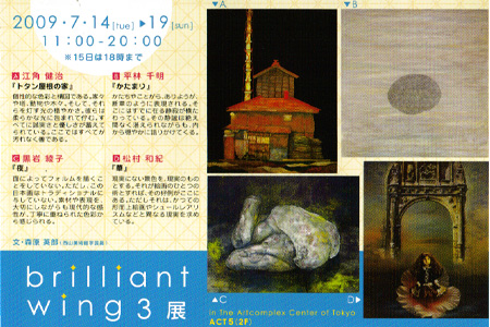 A江角 健治 『トタン屋根の家』 個性的な色彩と構図である。家々や塔、動物や木々。 そして、それらを灯す光の穏やかさ。彼らは柔らかな光に包まれて佇む。 すべてに誠実さとやさしさが蓄えられている。ここではすべてが汚れなく善である。 B平林 千明 『かたまり』 かたちやことがら、ありようが、断章のように表現される。そこにはすでに在る静寂が横たわっている。 その静謐は絶え間なく湛えられながらも、内から穏やかに語りかけてくる。 C黒岩 綾子 『夜』 面によってフォルムを描くことをしていない。ただし、この日本画はトラディショナルに与していない。素材や表現を、 大切にしながらも現代的な感性が、丁寧に重ねられたし記載から感じられる。 D松村 和紀 『華』 現実にない景色を、現実のものとする。それが絵画のひとつの術とすれば、その好例がここにある。 ただしそれは、かつての形而上絵画やシュールレアリスムなどと異なる現実を求めている。