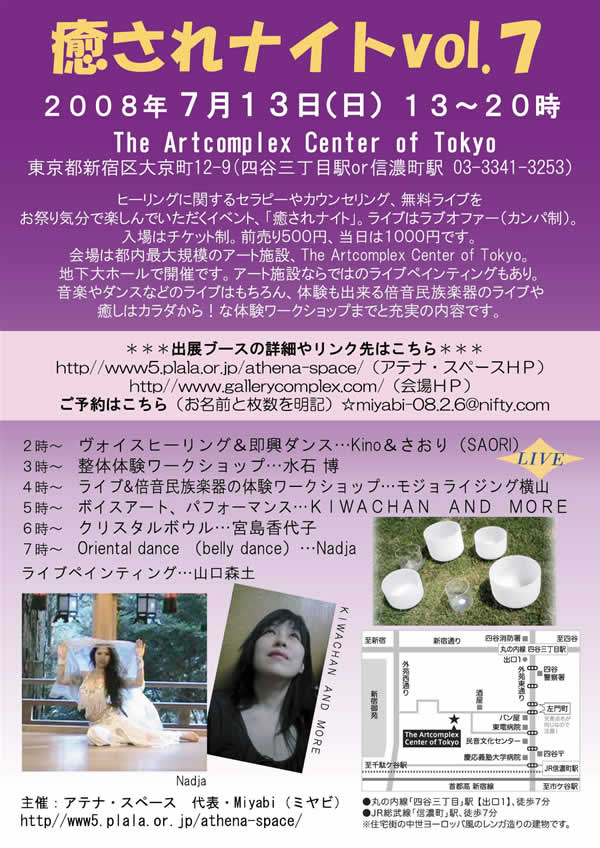 | ●開催日 7月13日(日)13〜20時 ●ライブ出演者 2時〜 ヴォイスヒーリング&即興ダンス…Kino&さおり(SAORI) 3時〜 整体体験ワークショップ…水石 博 4時〜 ライブ&倍音民族楽器の体験ワークショップ…モジョライジング横山 5時〜 ボイスアート、パフォーマンス…KIWACHAN AND MORE 6時〜 クリスタルボウル…宮島香代子 7時〜 Oriental dance (belly dance)…Nadja 詳細はこちら(http://www5.plala.or.jp/athena-space/iyasare7naiyou.html ) ●ライブペインティング 山口森土 ●出展ブース(詳細はこちら) (http://www5.plala.or.jp/athena-space/iyasare7naiyou.html) ●主催:アテナ・スペース 代表・Miyabi(ミヤビ) miyabi-08.2.6@nifty.com http://www5.plala.or.jp/athena-space/ |