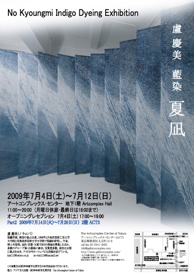 「盧慶美 藍染 夏凪」 No Kyoungmi Indigo Dyeing Exhibition 7月4日(土)〜12日(日)11:00-20:00(月曜休館) レセプションパーティー:7月4日(土)17:00-19:00 盧慶美 染織作家。1999年より金沢美術工芸大学大学院と 京都造形芸術大学大学院で染織りを研究し、 今春、博士号を取得。金沢・京都・大坂で8回の個展を開催したほか、 多数のグループ展・公募展に参加。現在は京都に拠点をおき、 アメリカやヨーロッパにも活動を拡げている。 この展覧会は(財)神林留学生奨学会の研究助成金で行なわれています。 協力 アジア文化会館 (財)神林留学生奨学会 The Artcomplex Center of Tokyo