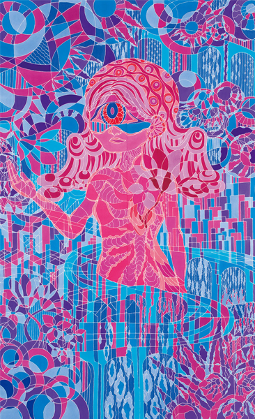 今回私は、白い線が画面の中で色と色の区切りだけではない働きが生まれることを目指し作品を作りました。