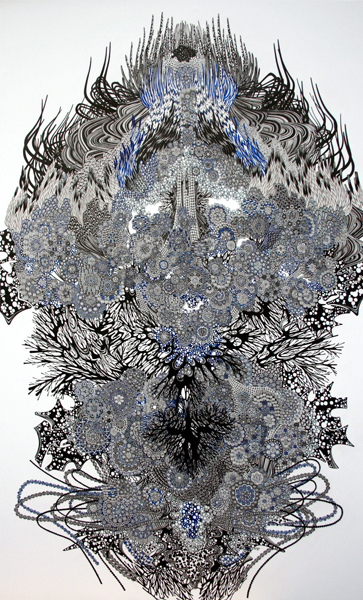 パネル張りしたケント紙に、ロットリングペンで地道に地道に絵を描いています。すごく時間がかかります(最大のもので一日中描いて半年くらい)。抽象的な紋様に、生きものの息づかいを吹き込むつもりで描いています。京都での展示は初めてです。成果を是非とも御高覧下さい。