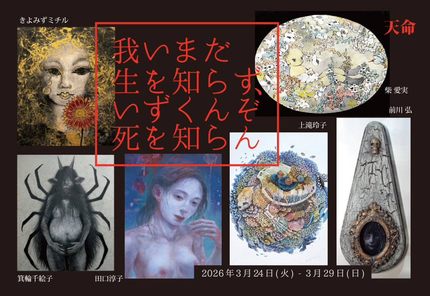 ![]() ACT企画グループ展「我いまだ生を知らず、いずくんぞ死を知らん」 いまだ生を知らず、いずくんぞ死を知らん まだ生きることも知らないのに、死についてなどわかるはずもない/孔子『論語』 国や宗教、それぞれを取り巻く環境によって、人の生き死にに対する考え方は多種多様です。 人生百年時代と云われる昨今、性別や生まれ、年齢に関係なく多様な生き方が可能となってきました。 その一方で「終活」や「入棺体験」、「生前葬」など、死はより身近に、よりポジティブなものへと日々変化しています。 いつ訪れるかわからない終わりに向けて、私たちは日々をどう生きていくか。 本展は「死生観を問いかける」展覧会になります。ACT5はACT取扱作家を中心に6名の作家によるグループ展、 ACT4は公募グループ展と2部屋をかけて展開いたします。 「天命」と「人事」が並び、同時開催となる2つの展覧会にはまさに【人事を尽くして、天命を待つ】作家の思いが 込められた作品が並び、鑑賞者へも問いかけることでしょう。 心ゆくままに、どうぞご高覧くださいませ。 ◆展覧会概要 会 期:2026年3月24日(火)~3月29日(日) 11:00-19:00※最終日は17:00まで 会 場:ACT5-天命 / ACT1-人事 合同作家交流会:3月29日(日)14:00- 「いまだ生を知らず、いずくんぞ死を知らんー天命」 会場:The Artcomplex Center of Tokyo ACT5 きよみずミチル https://x.com/kiyomizumichiru https://www.instagram.com/kiyomizumichiru/ 前川 弘 https://www.maekawa-hiroshi.com/ 上滝玲子 https://www.instagram.com/reiko_jotaki/ https://x.com/joh0602_07 箕輪千絵子 https://x.com/CHIEKO39 https://www.instagram.com/chiekominowa/ 田口淳子 https://junpero.wixsite.com/junkotaguchi https://www.instagram.com/junko_taguchi/ https://x.com/Junpero5 柴 愛実 https://www.instagram.com/shibamanami_art/ <同時開催> 「いまだ生を知らず、いずくんぞ死を知らんー人事」 会場:The Artcomplex Center of Tokyo ACT1 臼杵寿子/猫屋敷夜弌/菅谷一貴/孝州/六合九里/nakachan13/ROMAN/武藤紗緒里(メインビジュアル) |