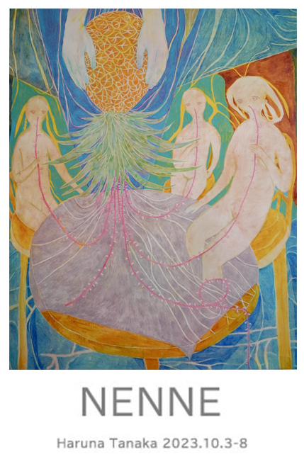 個展について 私は一枚の絵を描き続けていると、描き始めの動機やイメージしていたものから離れたり、変 化していくことが幾度もあります。そして、完成した絵を見つめてみても、描いている最中の気持 ちは思い出せません。 完成した数枚の絵を部屋に並べてみると、絵たちは眠っている様に感じました。動機が変化し ても、気持ちが思い出せなくても、絵を見つめているとふと感覚がよみがえることがあります。 また、全く別の新たな思いが生まれることもあります。たくさん眠って目覚めた時のように。 眠っている状態を表現する言葉は複数ありますが、私にとって一番身近な表現であることから 「NENNE」としました。